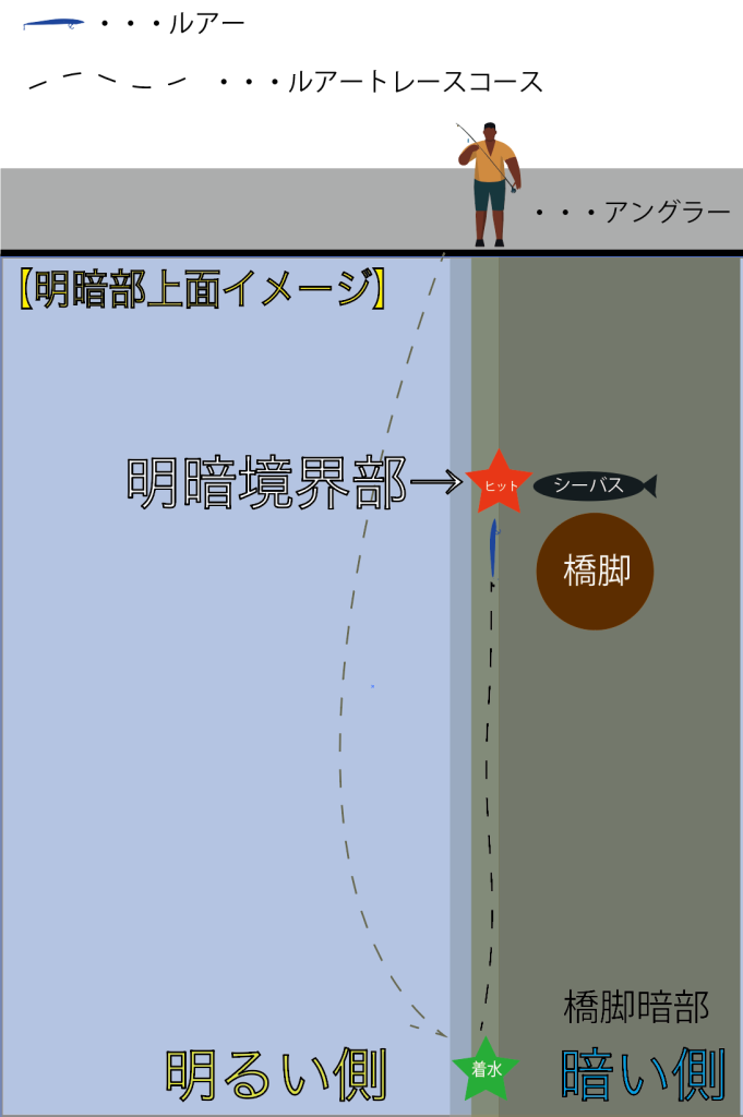 イメージ画の様に明暗の境目をゆっくり表層をリトリーブするだけで釣ることができます。