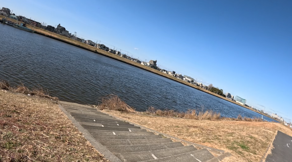 西水元水辺の公園では、公園脇から中川に向かって釣りができそうな場所を発見。