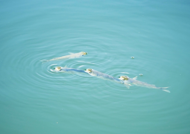 産卵で弱ったシーバスが流れているバチを荒食いするといった状況になるため、水面の変化(ボイル)が確認できシーバスの居場所が確認しやすい。
