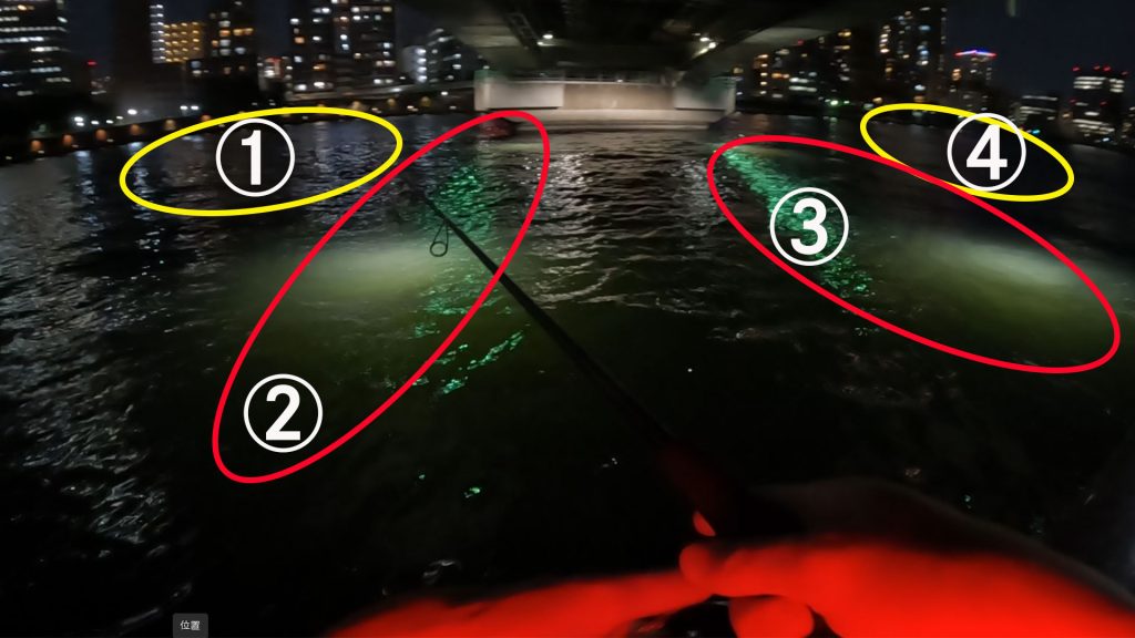 他の橋脚を攻めるような明暗や橋脚ではなく、スポットライト4か所を狙う釣りになります。